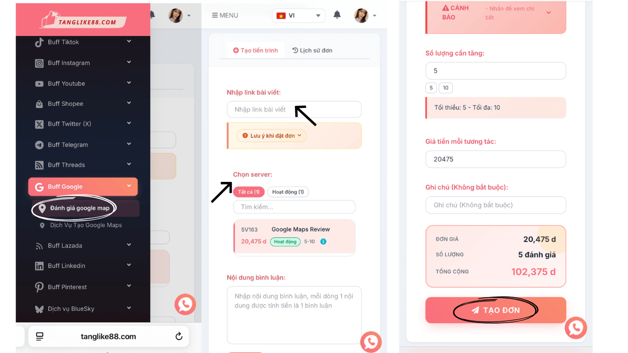 Lựa chọn gói tăng đánh giá phù hợp với nhu cầu: số lượng đánh giá, tốc độ thực hiện, nội dung đánh giá nếu có. Sau đó, nhấn “TẠO ĐƠN” để hệ thống tự động xử lý. Đánh giá sẽ được tăng dần theo đúng cam kết, đảm bảo tính an toàn và tự nhiên.