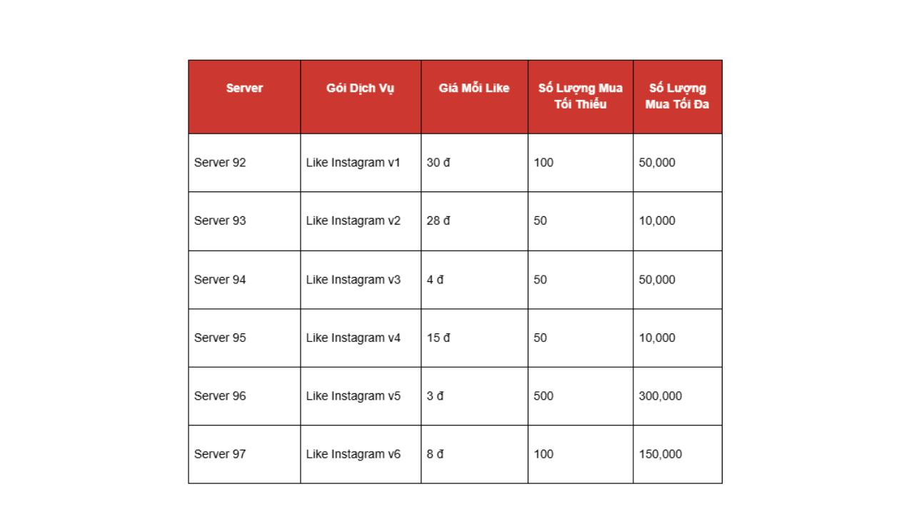 ???? Lưu ý: Tùy vào mục tiêu (like nhanh, ổn định, tiết kiệm hay số lượng lớn), bạn có thể chọn server phù hợp. Gợi ý: Server 94 & 96 rất phù hợp cho người mới bắt đầu với chi phí thấp.