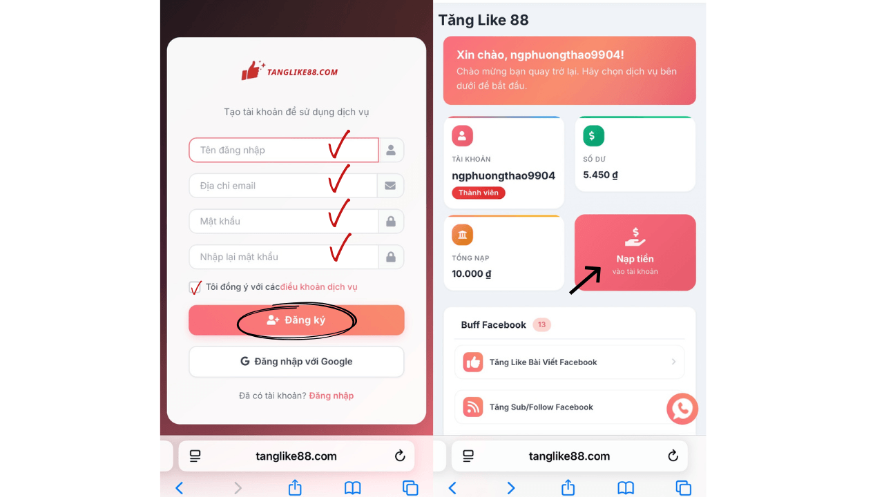 Bước 1: Đăng nhập hoặc đăng ký tài khoản trên tanglike88.com