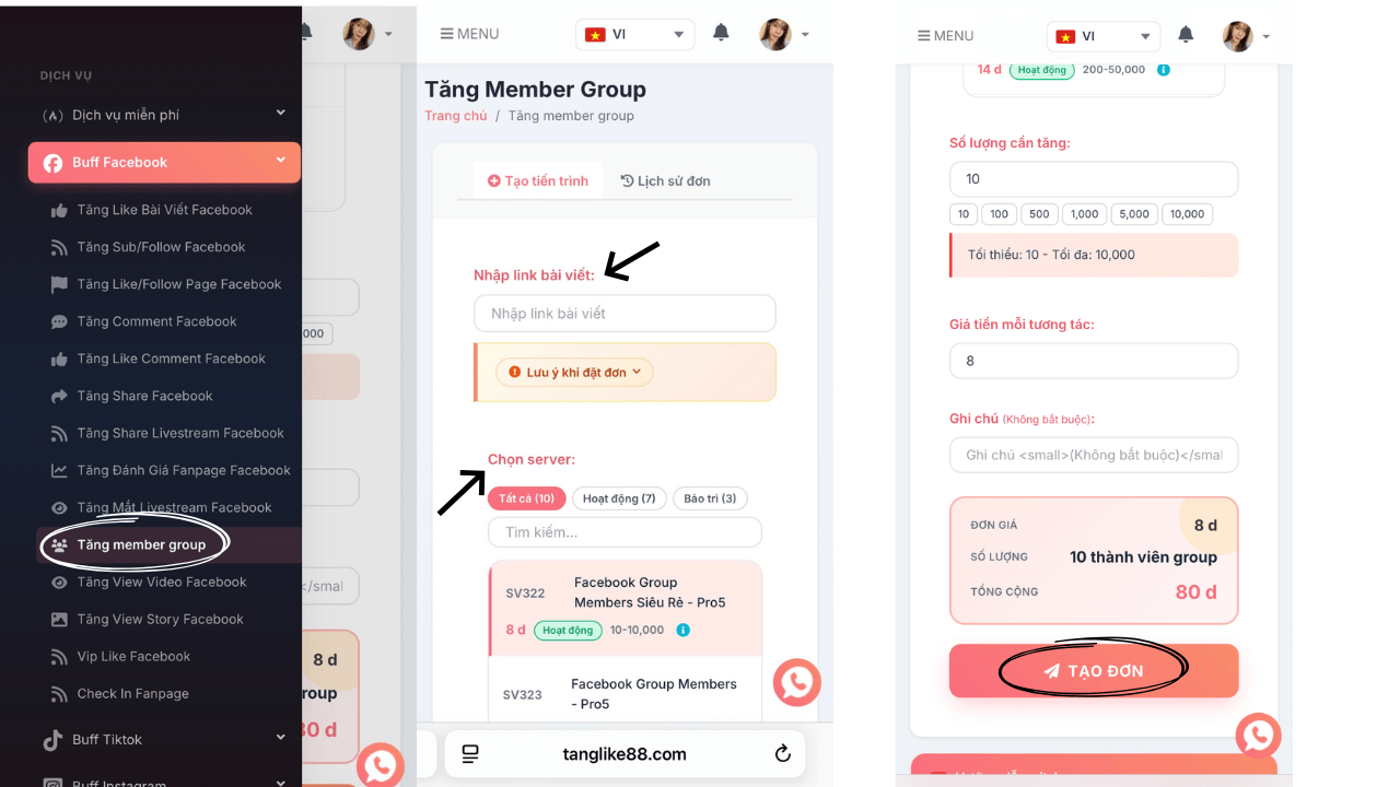 Nhập link group Facebook bạn muốn tăng member bạn Chọn server > Nhập số lượng member bạn cần tăng > Bấm "TẠO ĐƠN". Số member bạn đặt hàng sẽ được tăng sau khoảng 10 phút sau khi tạo đơn.